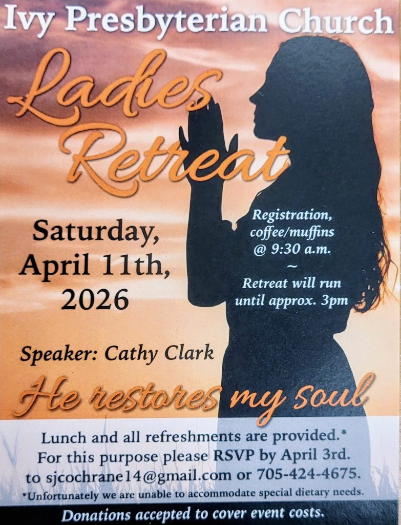 Ivy Presbyterian Church will be holding a ladies retreat on Saturday, April 11th, 2026. Registration, coffee/muffins will be at 9:30 AM; the retreat will run until approximately 3:00 PM.