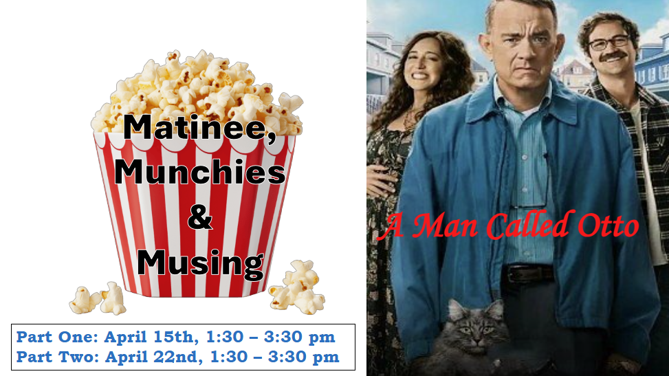 Come and watch the movie, A Man Called Otto, starring Tom Hanks, have some snacks and a discussion about this fascinating film. Part One will be on Wednesday, April 15th, and Part Two will be on April 22nd, at