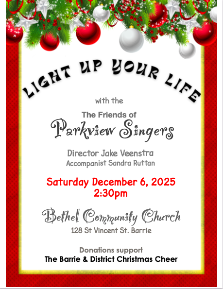 The Parkview Singers will be holding a concert on Saturday, December 6th, 2025, at 2:30 PM. The concert will be held at the Bethel Community Church, located at 138 St. Vincent Street, Barrie.