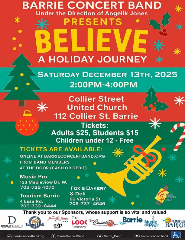 The Barrie Concert Band will be holding a concert Saturday, December 13th, at Collier Street United Church. The concert will take place from 2:00 PM to 4:00 PM. Tickets are available at the door or online at barrieconcertband.org